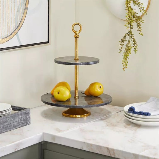Black Marble 2-Tiered Cake Stand with Gold Post