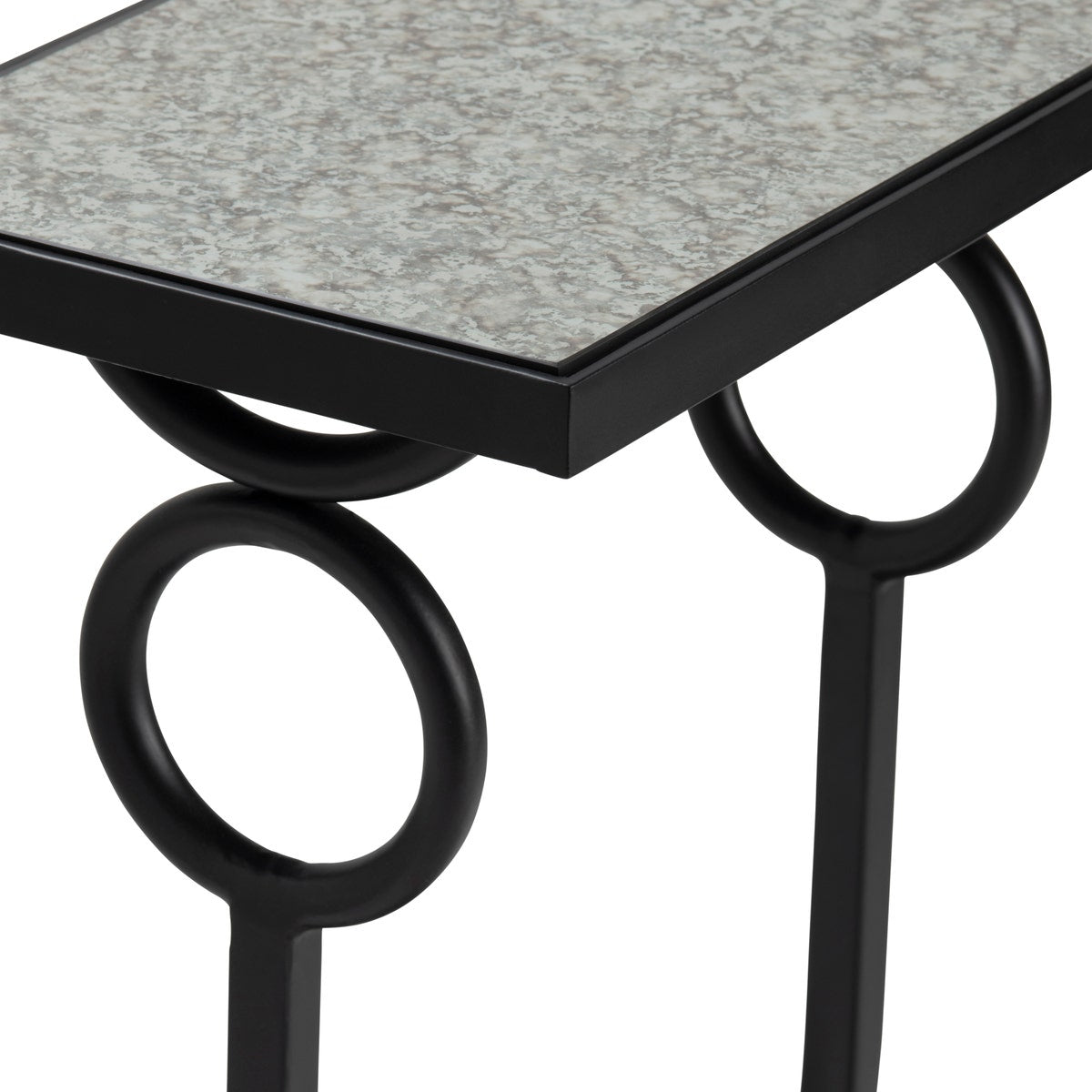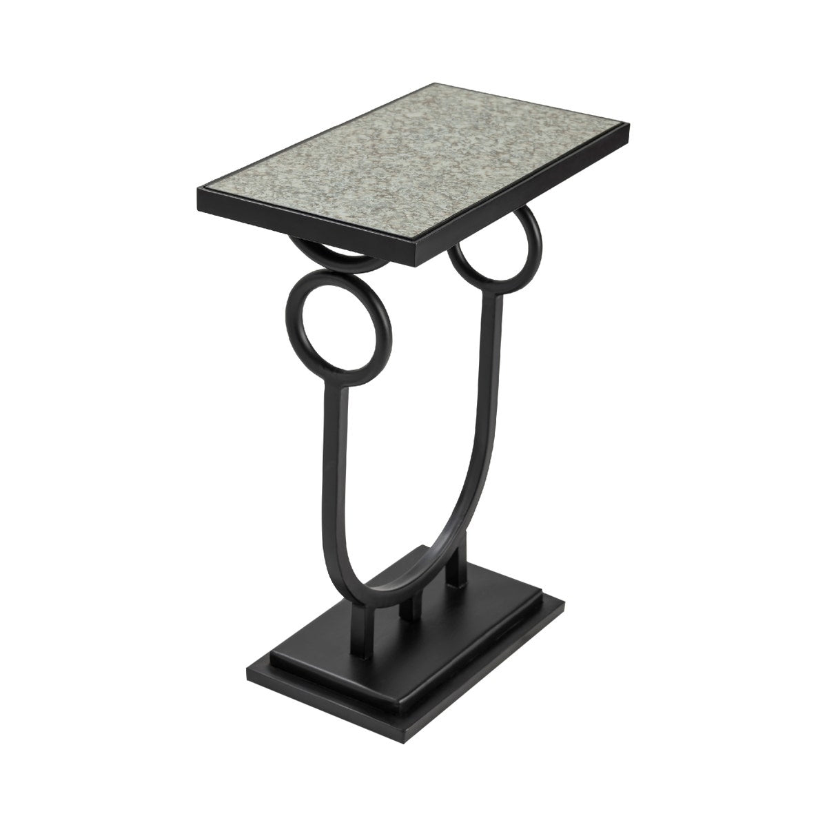 Crafted with a robust black iron base, the Abrams Accent Table features a U-shaped brace that not only adds a touch of elegance but also ensures stability and strength. The playful balance of the design creates a captivating visual experience, making it an eye-catching addition to your décor. The mottled glass tabletop introduces intriguing patterns, casting beautiful reflections and adding a layer of sophistication to your space.