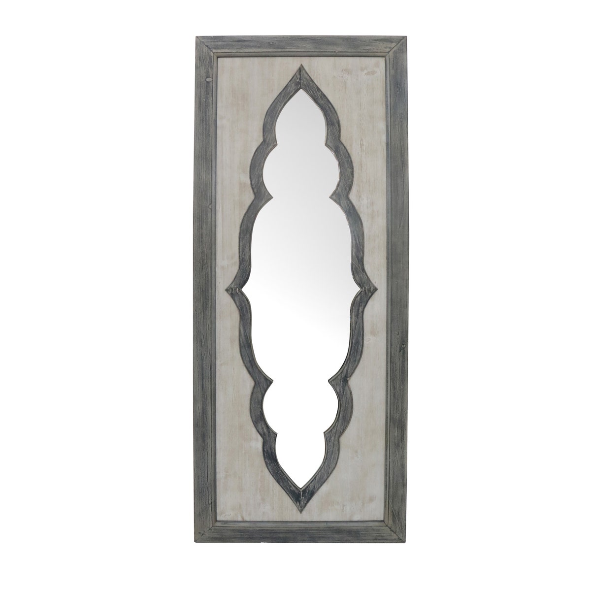Transform your space with the Crestview Contouring Mirror, a stunning piece that seamlessly blends transitional and rustic styles. Crafted from light grey wood and framed in dark grey, this mirror features an exquisite scalloped design inspired by middle-eastern motifs, making it a striking addition to any room.