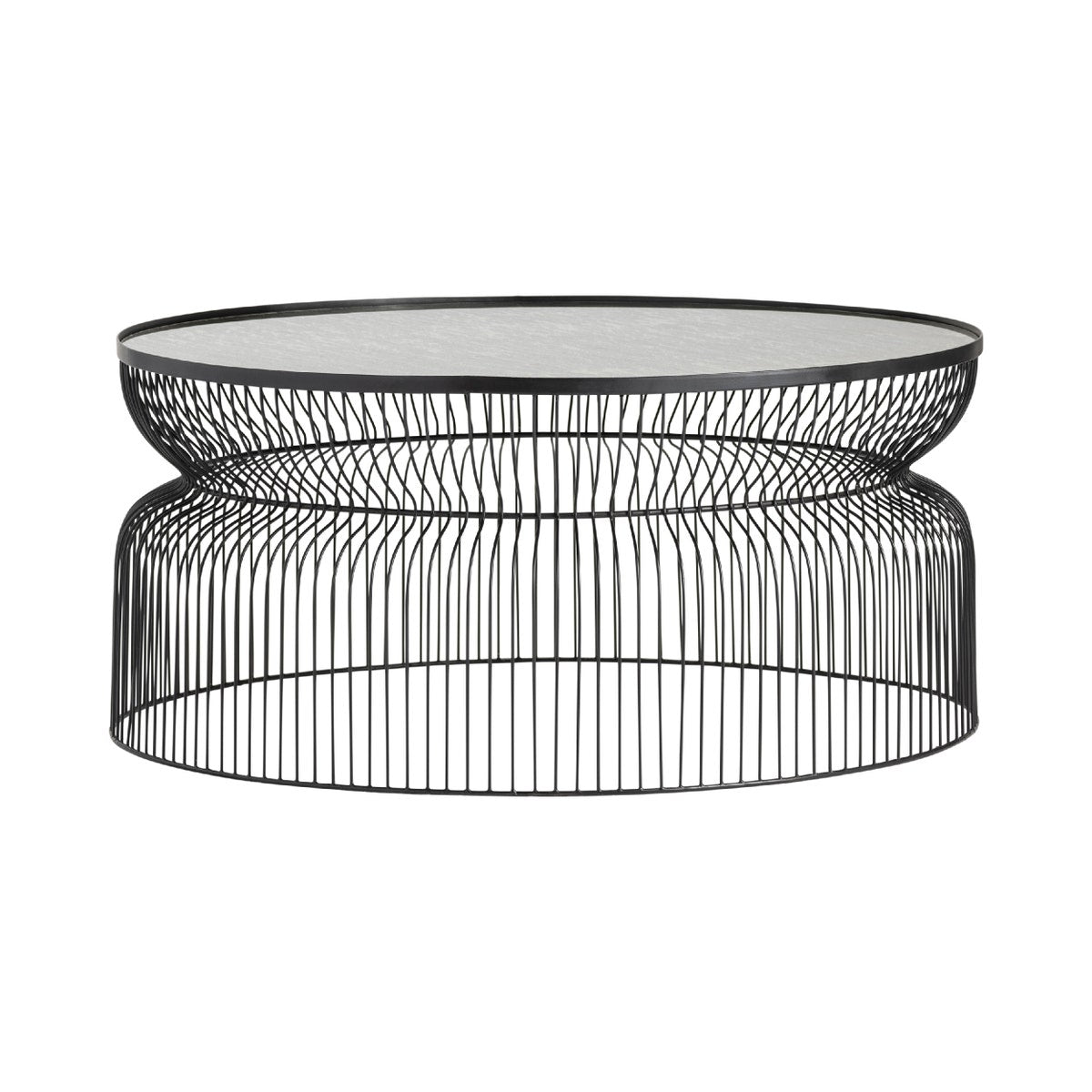 Elevate your living space with the Crestview Montreal Cocktail Table, a stunning blend of modern design and functional elegance. This captivating round metal wire cocktail table is encircled with sleek black iron, creating an alluring illusion of a sophisticated basket weave formed by straight lines, offering a unique visual appeal that resonates with both minimalist and bold décor styles.