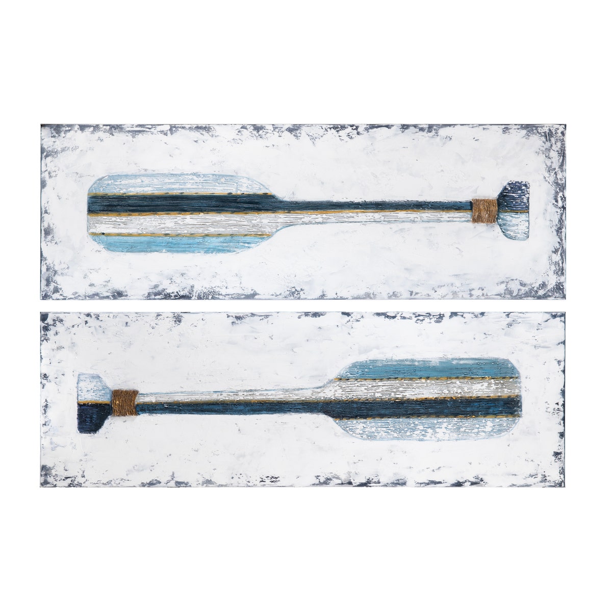 Transform your space with the Crestview Paddles Up Wall Art - Set of 2, a stunning addition that effortlessly enhances any beach-themed decor. These coastal canvas paintings are meticulously designed to evoke the serenity of the seaside, featuring intricate beach oar paddles adorned with 3D rope embellishments that provide a realistic touch.