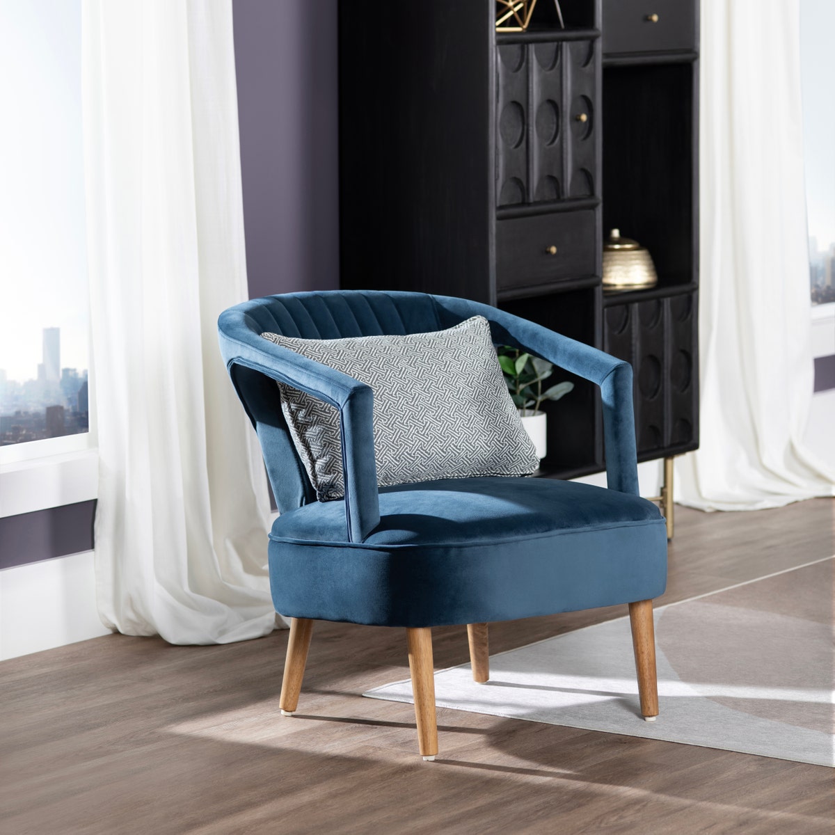The Pearson Accent Chair is perfect for enhancing various decor styles, thanks to its soft, textured finish that envelops both the cushioned seat and back. With open armrests inviting you to unwind, every sit is an experience in comfort. The rich blue hue harmonises beautifully with the light brown rubberwood legs, creating a striking visual contrast that ensures this chair remains a statement piece in your living space.