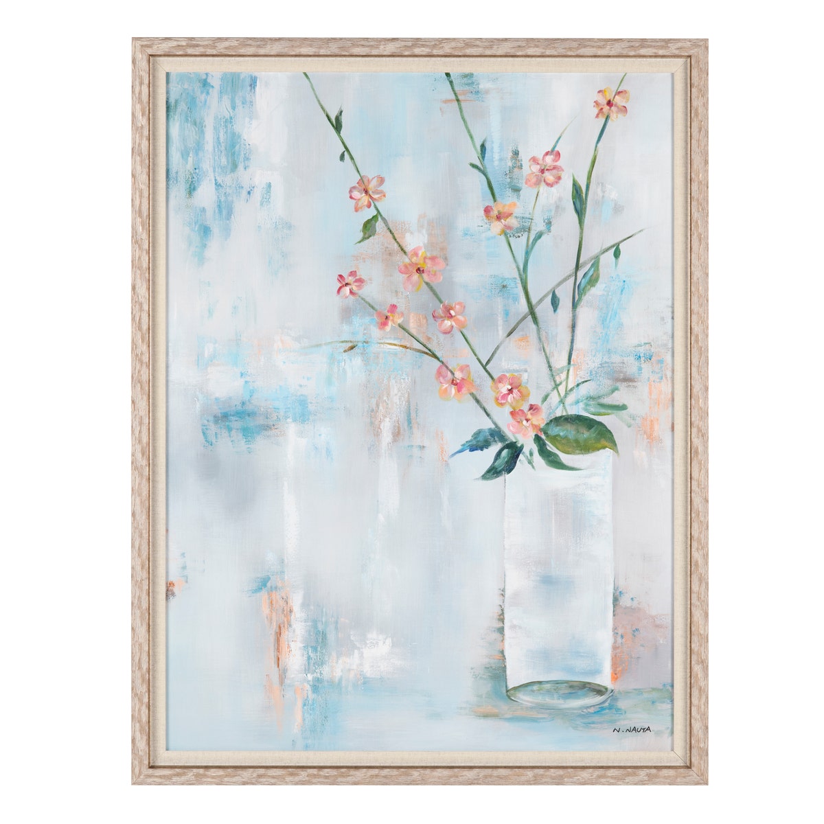 Crafted with care, this traditional still life painting showcases a charming vase filled with delicate pink flowers, contrasted beautifully against subtle shades of blue in the background. Its generous dimensions of 40 inches by 52 inches make it a captivating focal point for any room, whether it be a living room, bedroom, or hallway.