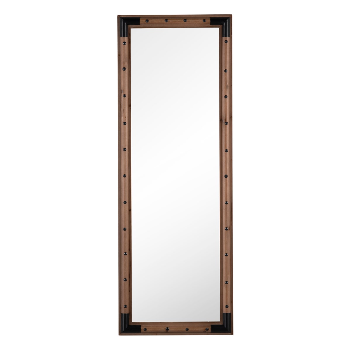 Crafted with a natural wood frame, the Tyson Mirror features distinctive black nailheads and striking black metal corners, which not only add a stylish flair but also ensure durability. The warm brown tones of the wood create an inviting atmosphere, making it an ideal addition to both modern and traditional decor themes.
