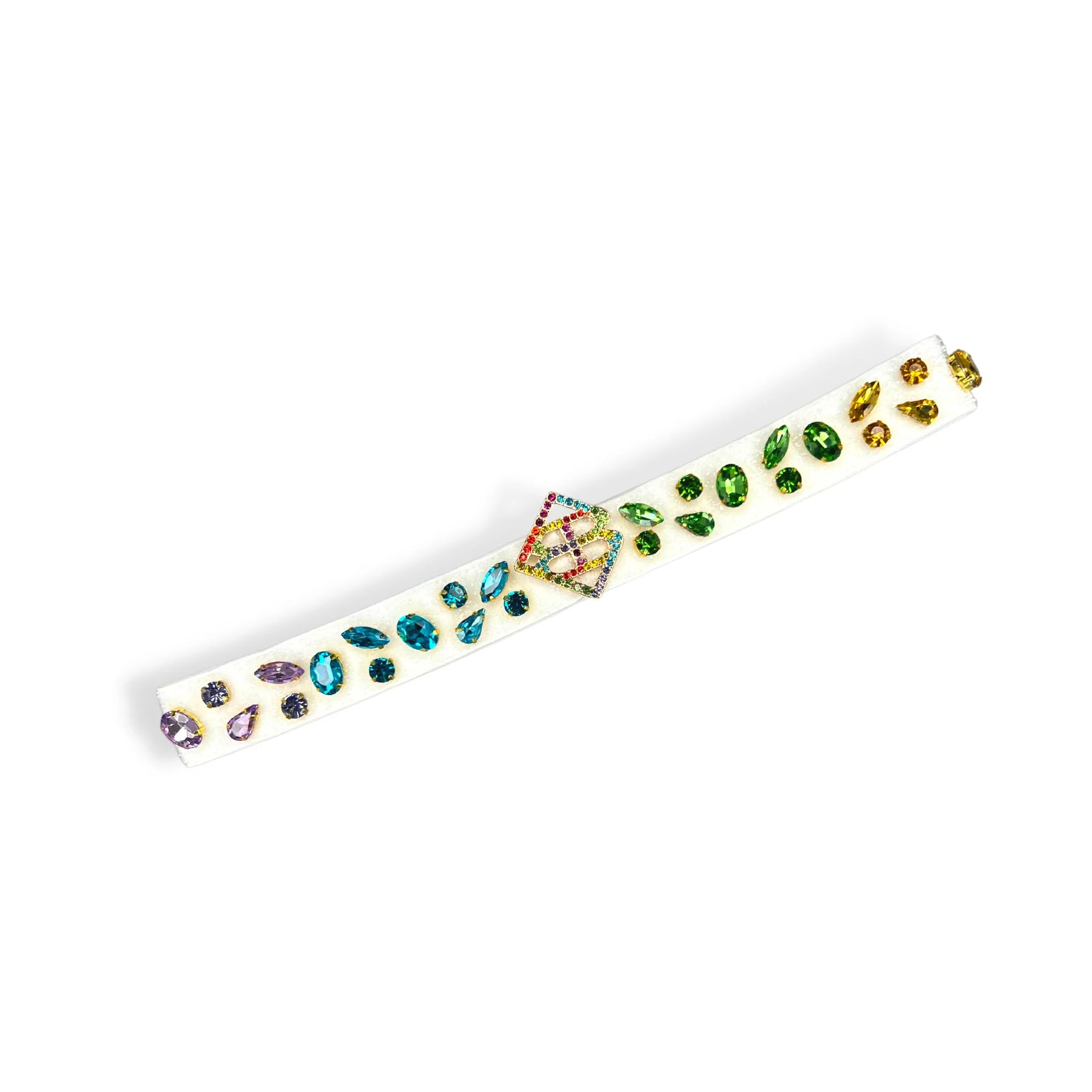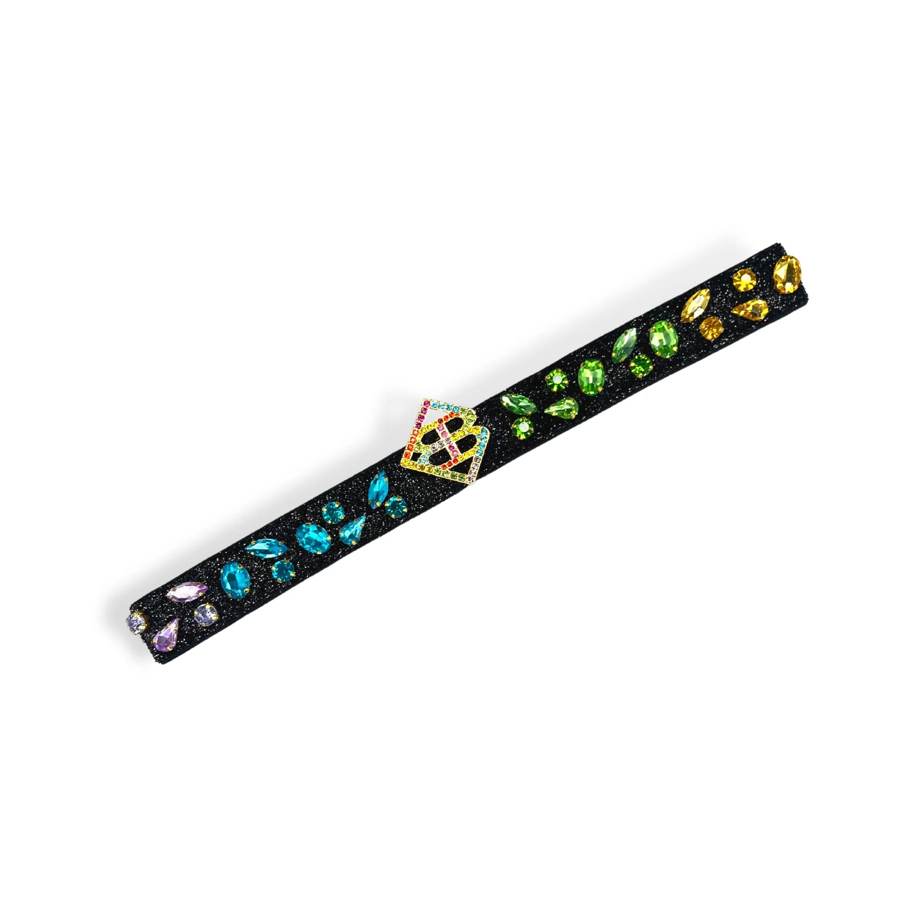 Immerse yourself in the enchanting rainbow gradient pattern adorned with hand-sewn glass crystals. Each crystal catches the light beautifully, adding a touch of sparkle and sophistication to your look. The gold-plated trademark BC logo serves as a chic signature touch, reflecting a commitment to quality and craftsmanship that you can wear with pride.