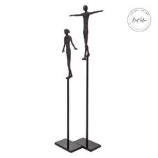 Elevate your space with the striking Navela Bronze Aluminum Sculptures, an artistically crafted set of two contemporary figurative sculptures. This sophisticated duo features elegantly elongated silhouettes - one male and one female figure - each mounted on sleek rectangular bases. The taller piece stands at an impressive 45 inches high with dimensions of 15.5"L x 5"W, while its companion reaches 38 inches with measurements of 8"L x 5"W. Crafted from durable aluminum with a rich bronze finish, these statuaries boast clean lines and graceful poses that capture the essence of modern minimalist design. The figures are expertly balanced on iron supports, anchored by solid marble bases that add a touch of luxury. Perfect as statement pieces in an entryway, flanking a fireplace, or as sophisticated accents in a living room or office space, these sculptures bring an air of artistic refinement to any interior setting. Their slender profiles and harmonious proportions make them versatile enough to complement both contemporary and transitional decor styles.