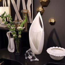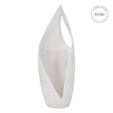 The Praxley Hurricane is an elegantly designed candleholder crafted from quartz sand in a pristine white finish. Standing 31.5 inches tall with a width of 10 inches and depth of 10 inches, this sculptural piece features a distinctive teardrop silhouette with graceful curves and an asymmetrical opening. The contemporary design incorporates clean lines that create dramatic shadows when lit, making it a striking decorative accent both with or without a candle. Its substantial presence makes it ideal as a floor piece or statement centerpiece on a dining table or console. The hurricane's organic form and neutral palette allow it to complement both modern and transitional interior styles, while its generous proportions create an impactful visual anchor in any space. The piece can be styled individually or paired with complementary decorative objects to create an artful vignette.
